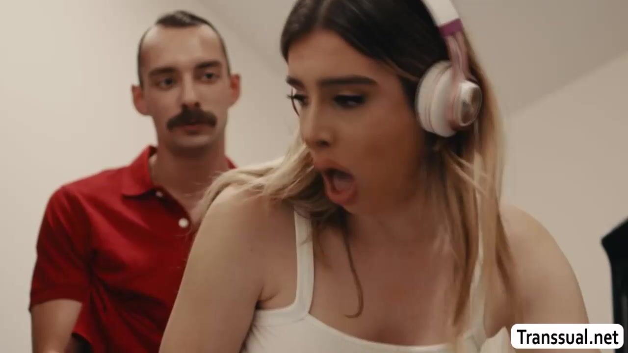 Stepdad watches his shemale stepdaughter in the laundry room and he then rips off her jeans and then he barebacks her tight ass.After that,they move into the bathroom and lets his TS stepdaughter suck his dick and rides it again.