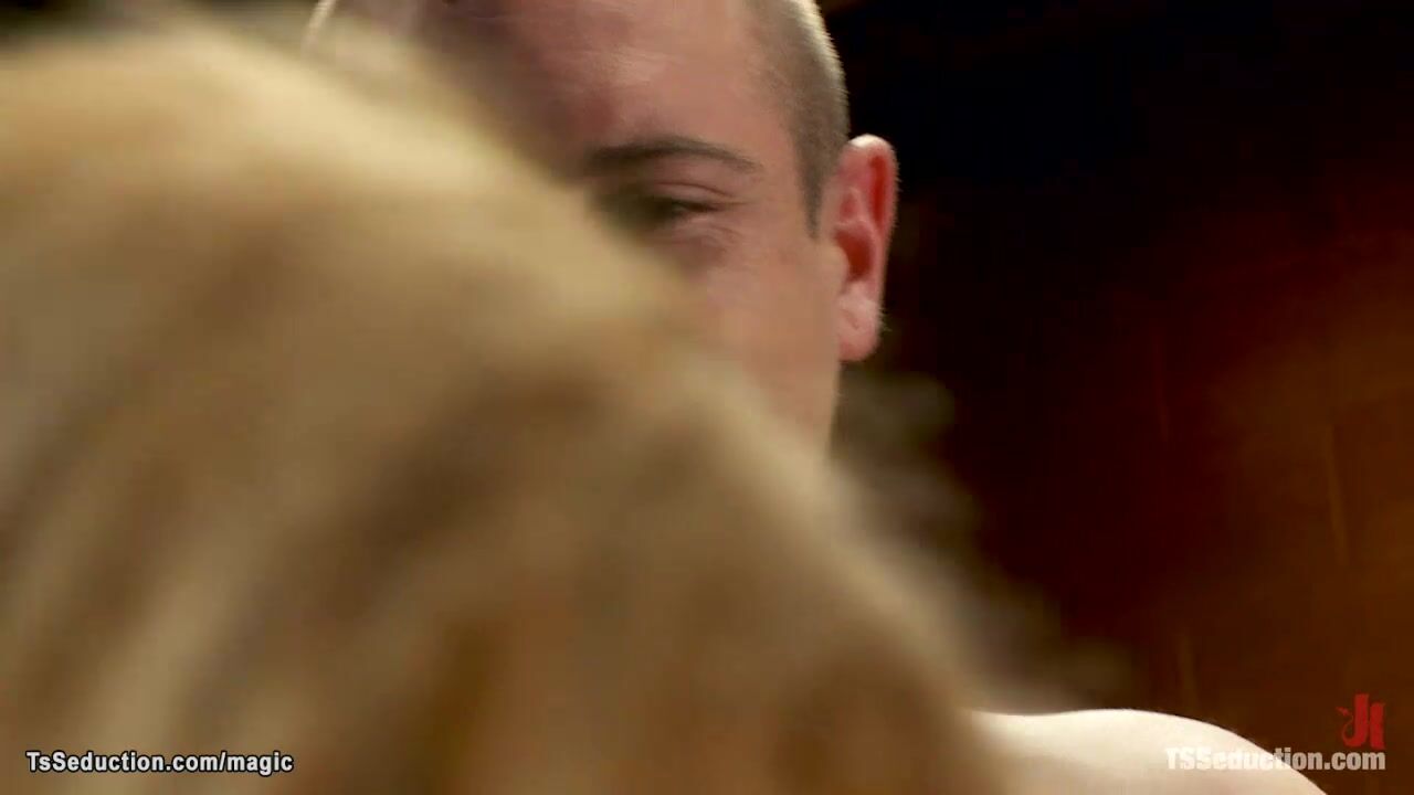 Big boobs blonde mature shemale dominatrix Johanna B ties John Jammen and fucks in mouth then pounds his ass with big dick till he cums