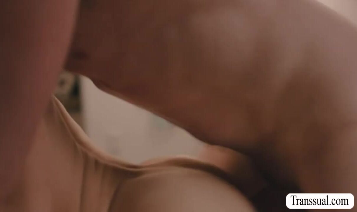 Horny blonde TS and her new handsome boyfriend gets home after they party.After that,they get so horny and start kissing each other on the bed.After that,she throats her new boyfriends big cock and lets him bareback fuck her wet ass so hard.