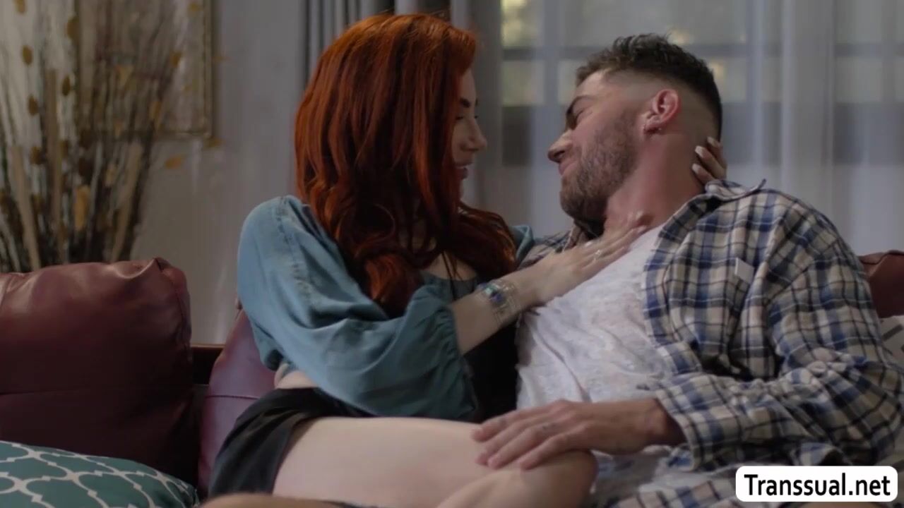 Redhead Tbabe and her new handsome boyfriend are on the couch kissing each other passionately.After that,she throats the big hard cock of her new boyfriend and in return,the dude bareback fucks her wet ass so deep and hard.