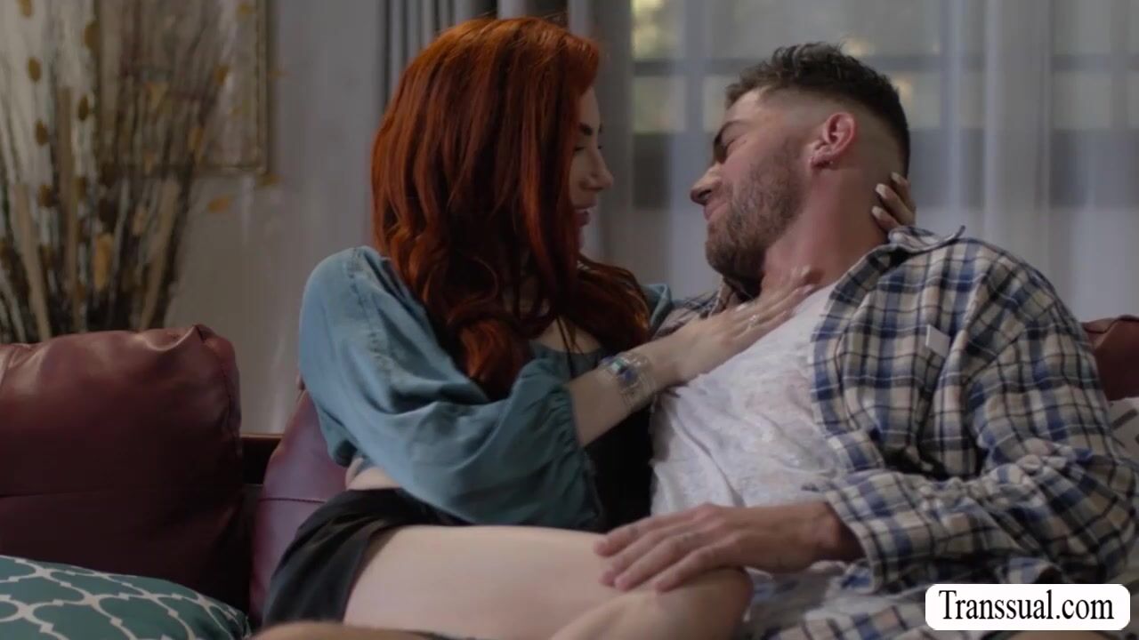 Redhead shemale and her new handsome boyfriend are on the couch kissing each other passionately.After that,she throats the big hard cock of her new boyfriend and in return,the dude bareback fucks her wet ass so deep and hard.