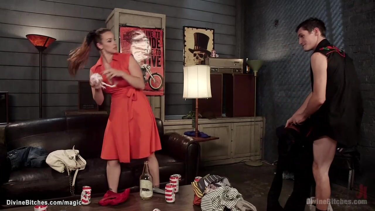 Huge tits MILF wife Bella Rossi dresses submissive husband Tony Orlando as maid then makes her fuck her with dildo gag before pegs him in the kitchen
