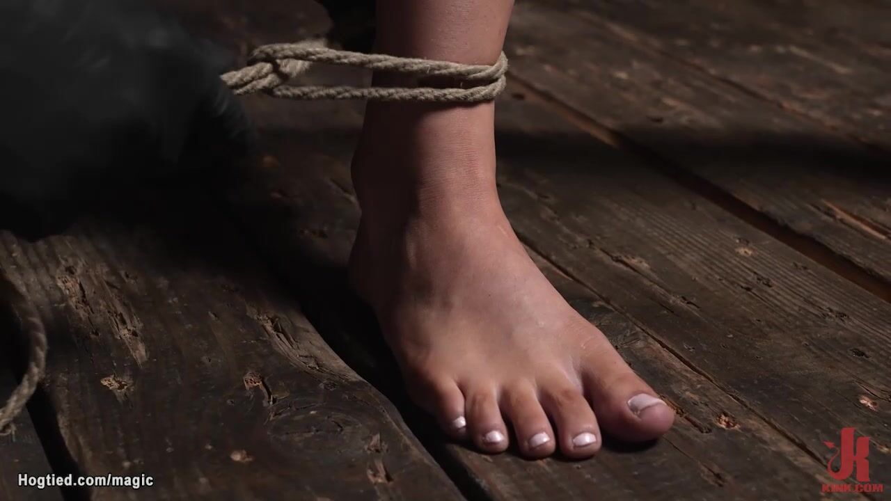 Big tits slave Penelope Kay is bound in standing position then laid on back pussy fingered till mounted on sybian by master The Pope in dungeon