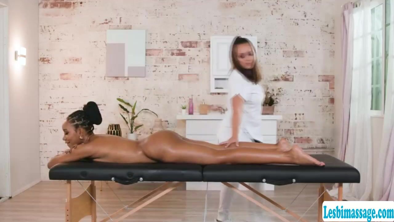 Busty masseuse meets her ebony customer in the massage parlor.After that,big tits ebony gets naked and lets the masseuse massage her back.Suddenly,the masseuse gets horny and start licking the ass and pussy of her black customer.