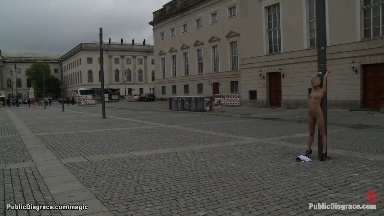 Naked Euro blonde babe Diana Pink is gagged and bound in public square for onlookers then gang bang fucked by big cock Tommy Pistol and strangers in various public places outdoor