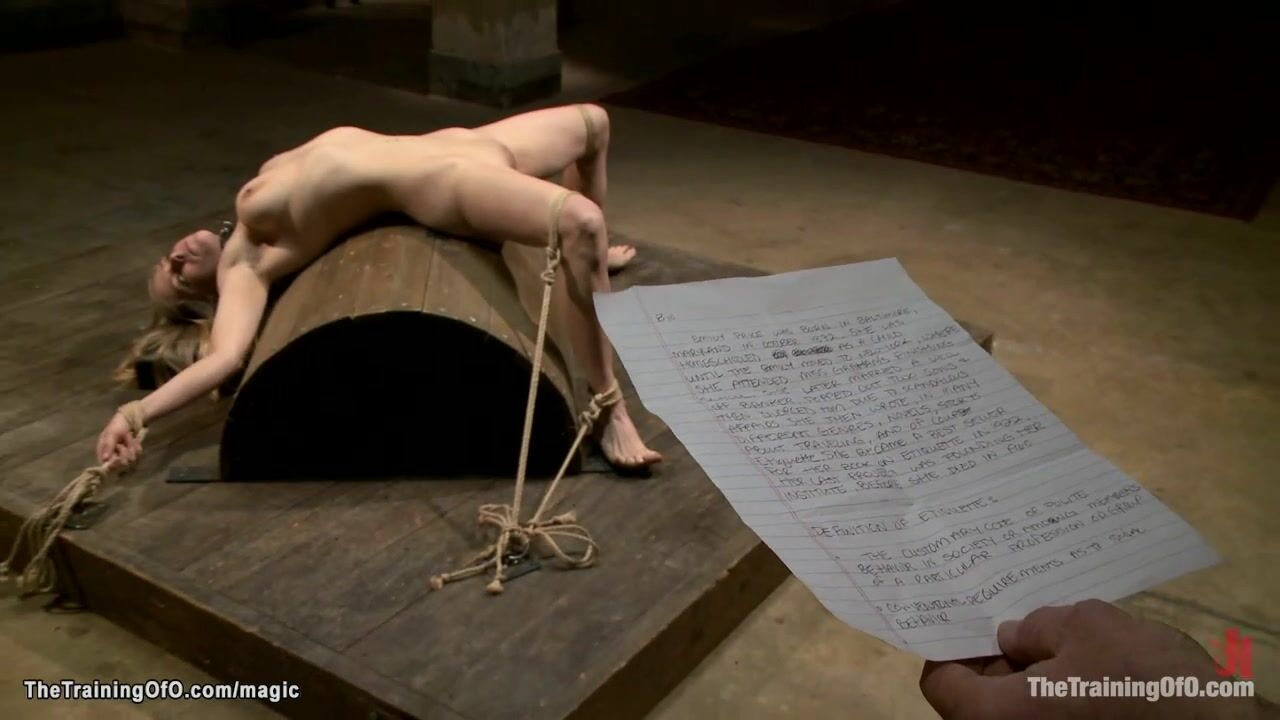 Natural big tits blonde slave trainee Penny Pax bound in back arch position whipped then bent over metal device anal fucked by big cock gimp Owen Gray and master James Mogul in threesome