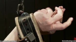 Sexy petite blonde slave Emma Haize balances on one foot with one leg chained up and arms cuffed and chained into strappado then bound on the floor waxed on device bondage