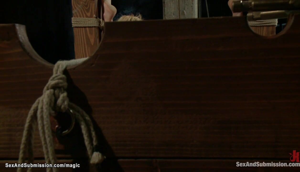 Busty blonde Allie James bound on knees gets tits paddled then trapped in wooden stock rough flogged and fucked by big cock master James Deen in dungeon