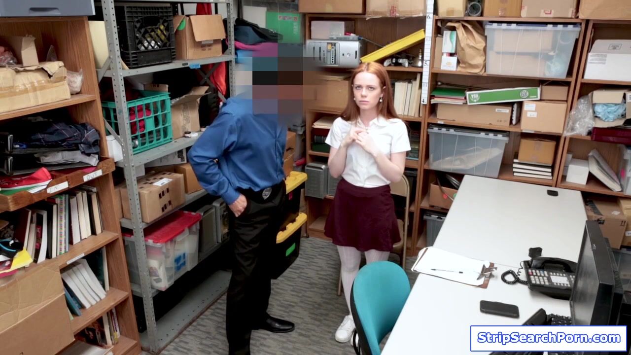 A security officer recovers several stolen jewelries after conducting strip search on a redhead teen.The small tits shoplifter cooperates in order to avoid jail.She goes down and blowjobs his big cock.Afterwards the officer fucks her hairy pussy.