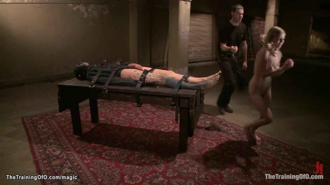 Big tits blond trainee Penny Pax gets ass plugged then made by master with flogger James Mogul deep throat suck huge dick to strapped in leather gimp Owen Gray