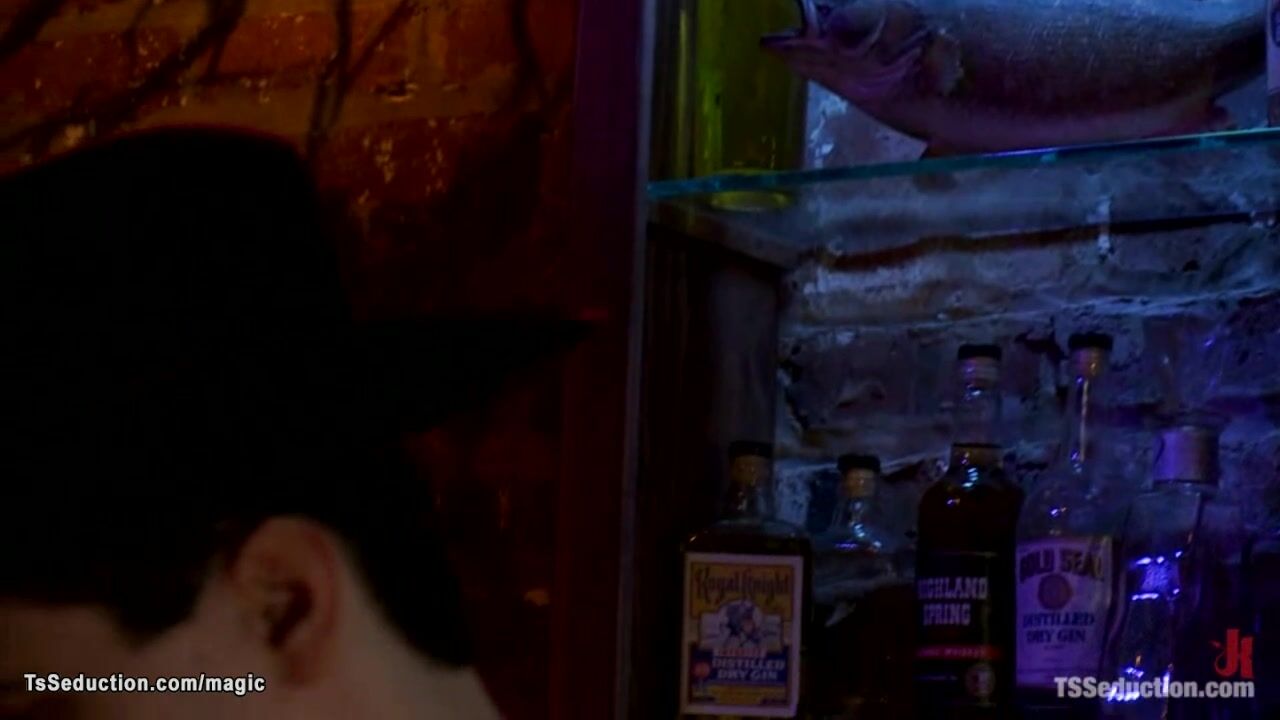 Big tits petite blonde shemale Paris A visits bar in the middle of the night and binds tall bartender Chris Ockham then anal fucks and spanks him