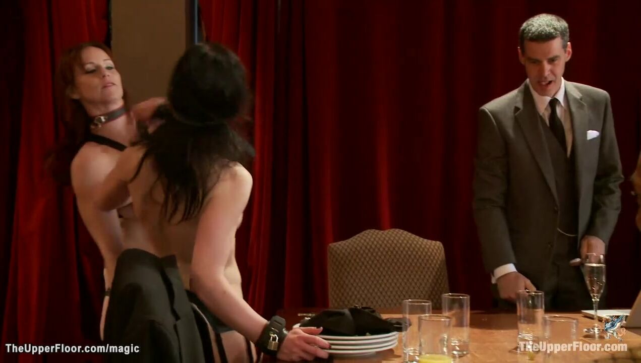 Big tits senior slave Bella Rossi makes gagged Juliette March serve guests at bdsm party then fucks her and ebony Nikki Darling in group in the Upper Floor