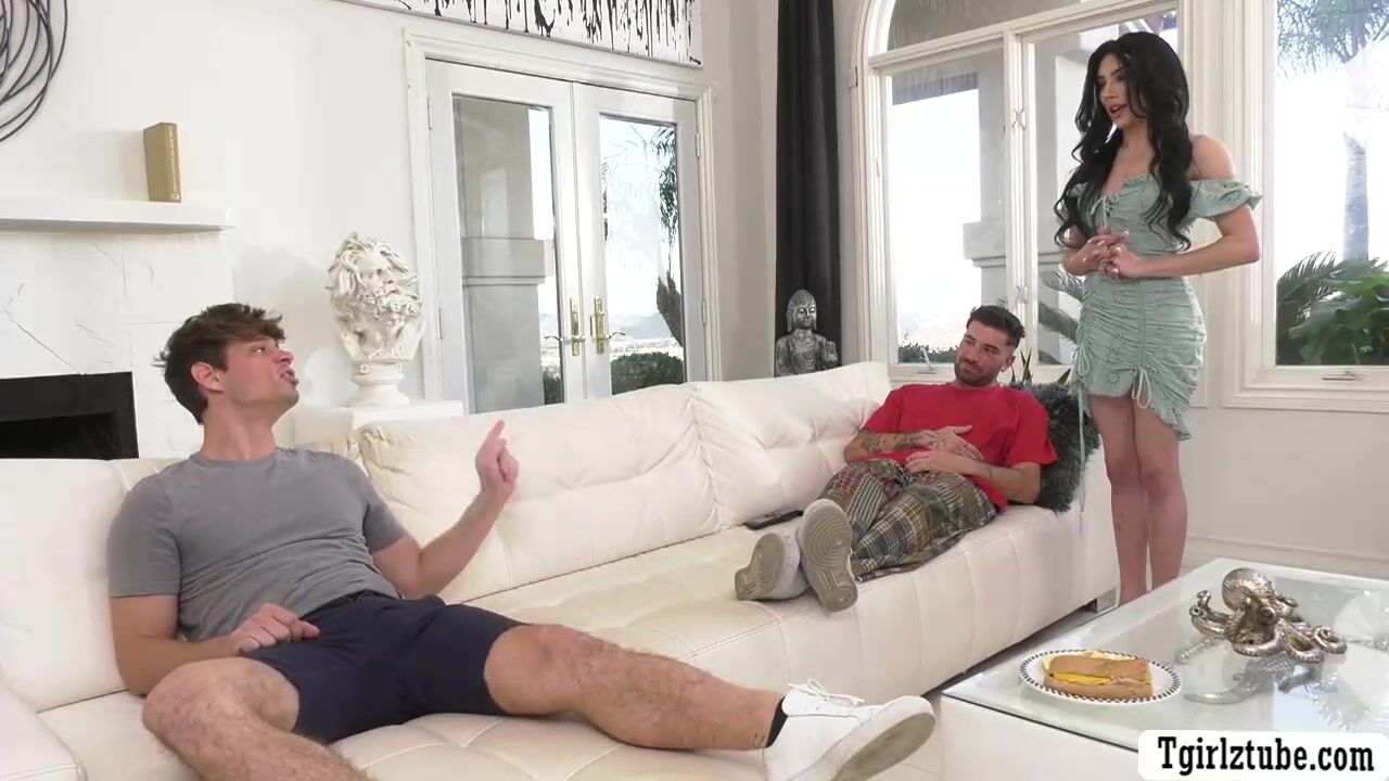 Busty Tgirl brings food for her stepbro and her new guy.After that,she throat their big cocks passionately and in return,the two horny dudes start barebacking the ass of big tits shemale so deep and hard.