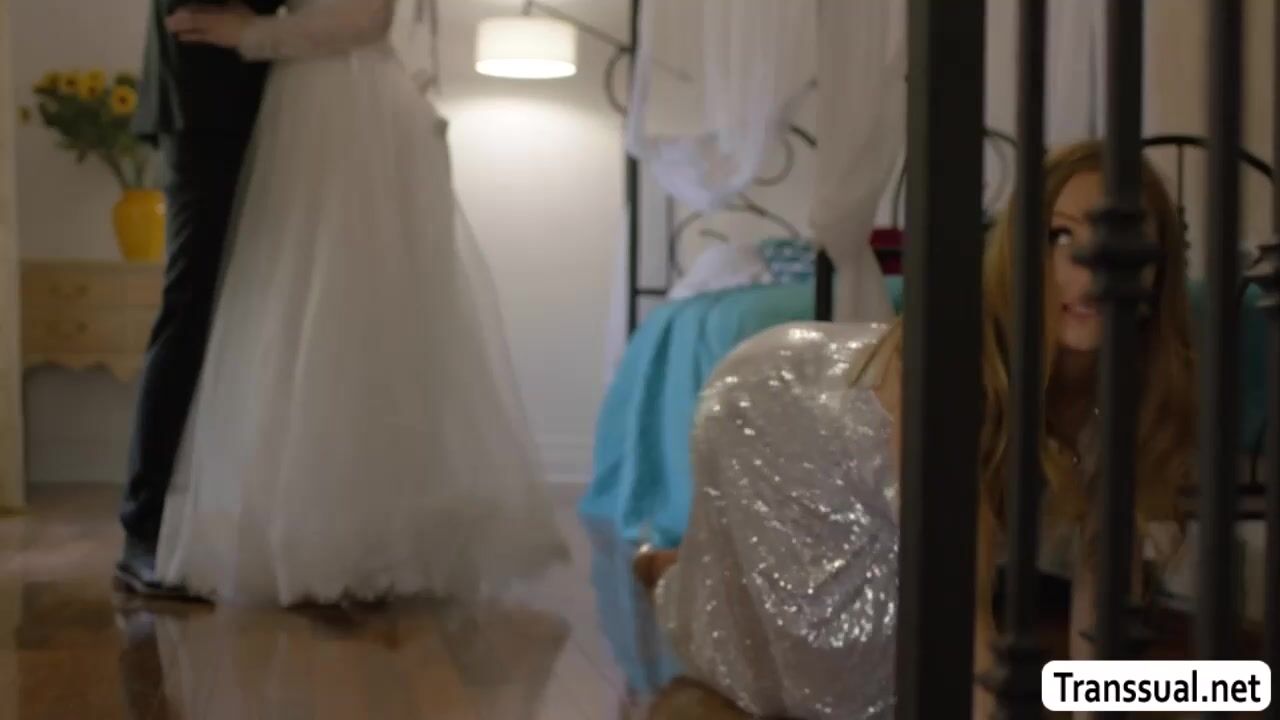 Trans bride and her future husband are in the room kissing each other.After that,she throats his dick and lets him bareback her ass.Suddenly,the brides maid enters the room and she then joins them fucking and do threesome sex.