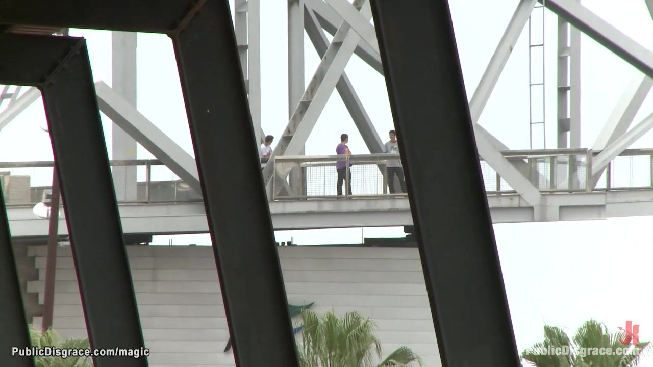 Naked handcuffed brunette Latina babe Lara Tinelli gets deep throat fucked in tunnel then fucked by big cock master Steve Holmes in public in front of strangers