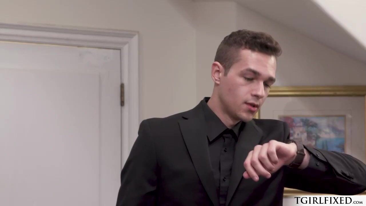 Jayden Marcos is dressed in a suit,checking his watch as he calls out to his shemale gf Jade Venus.The big tits trans wears her pantyhose.The ts deepthroat blowjobs his dick,then he bareback anal fucks her tight butthole from behind.