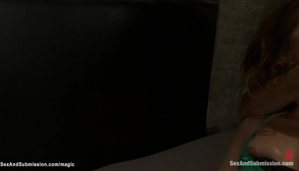 Brunette babe Riley Reid gets hogtied and throat fucked then shackled on back with legs open in the air pussy fisted by big cock master Tommy Pistol