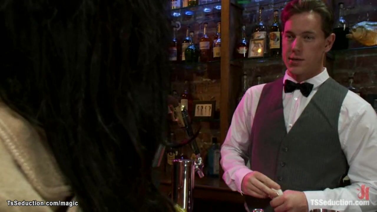 Hot big tits brunette Asian shemale lady Yasmine Lee seduces bartender Vern Hopkins and gets blowjob then anal fucks him bent over table after closing time