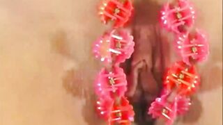 My dark-haired slave girl Linda trained in my BDSM cellar. she lies with her pussy spread and is totally at the service of my pleasure. I use the whip, I use pins and I let her cum under my direction.