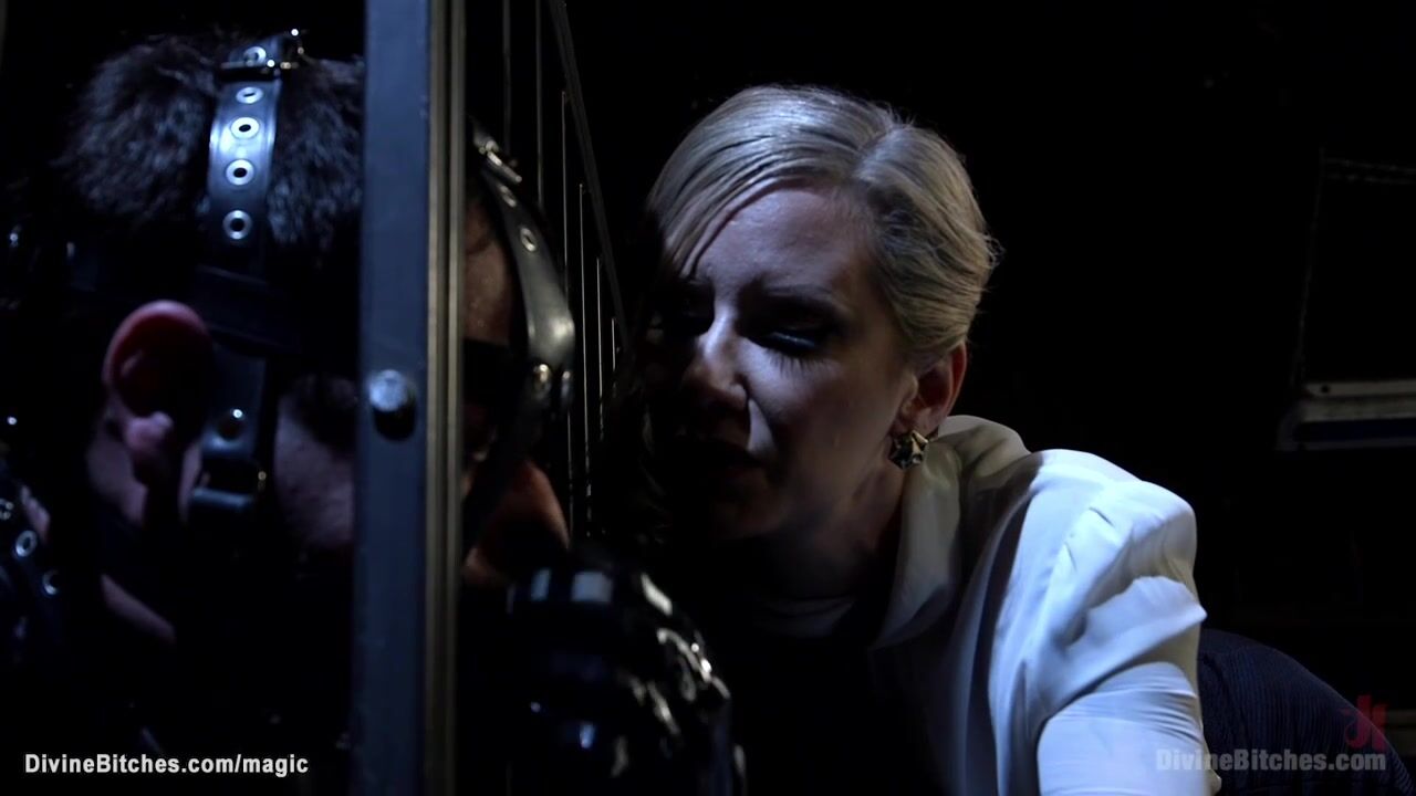 Hot blonde mistress Maitresse Madeline Marlowe in elbow high latex gloves anal fisting gimp and wnaks big cock to slaveboy DJ in threesome