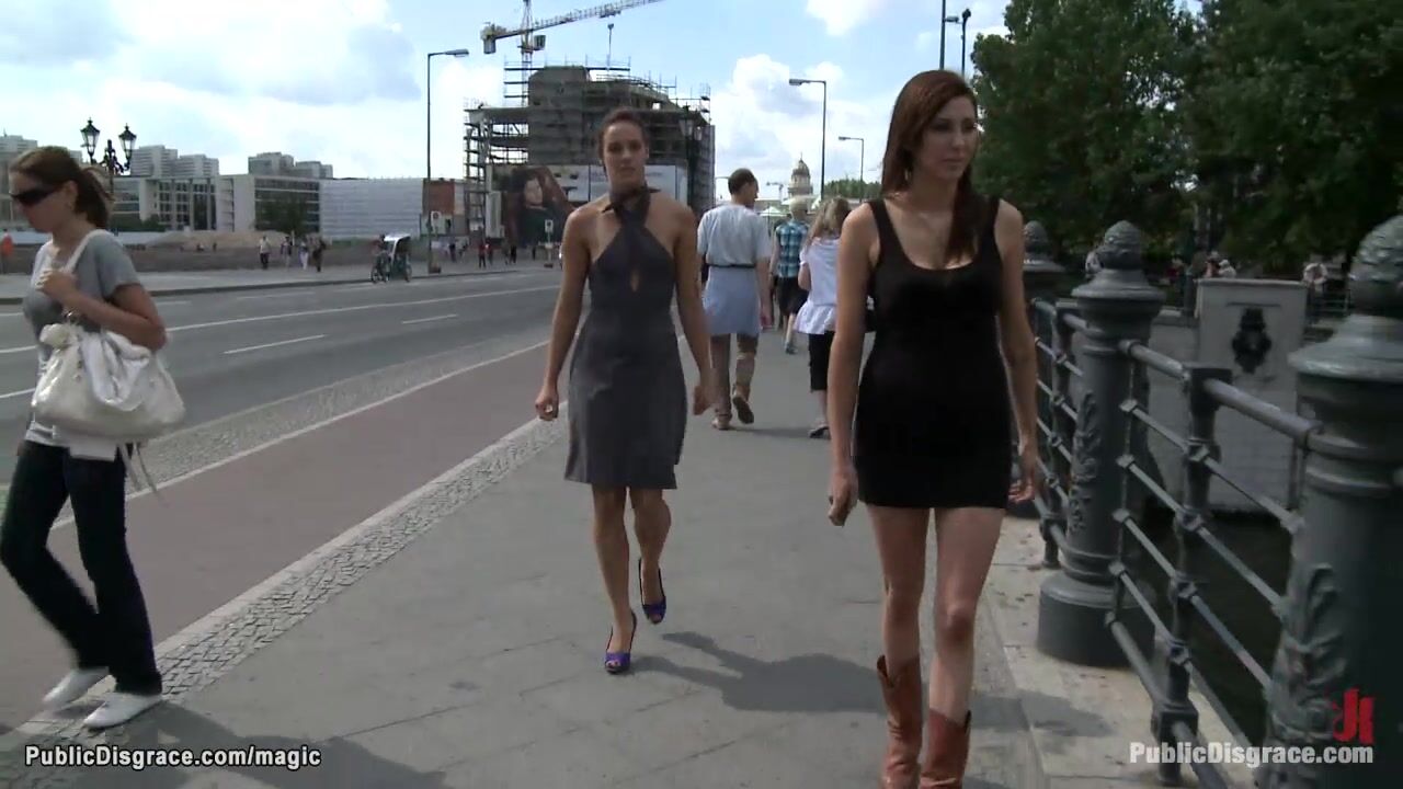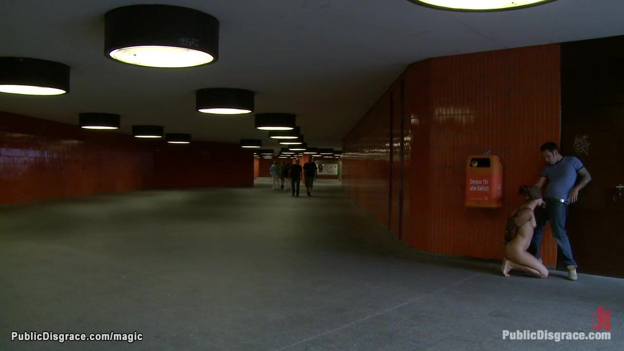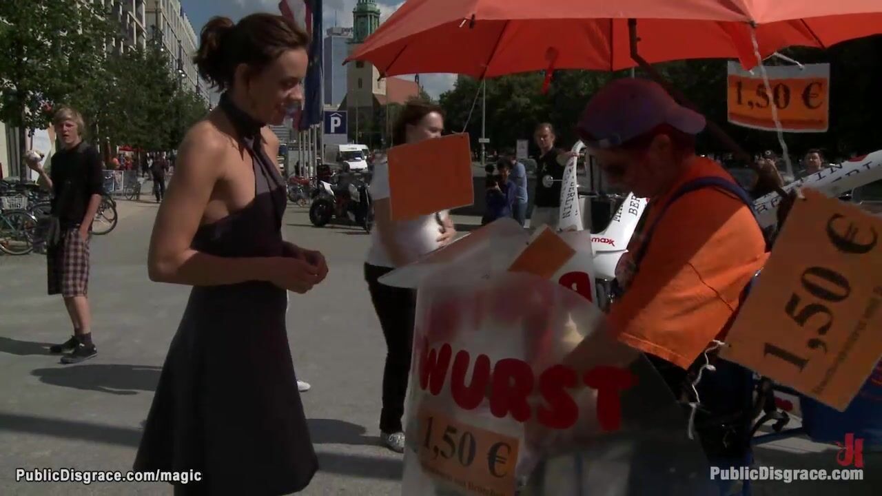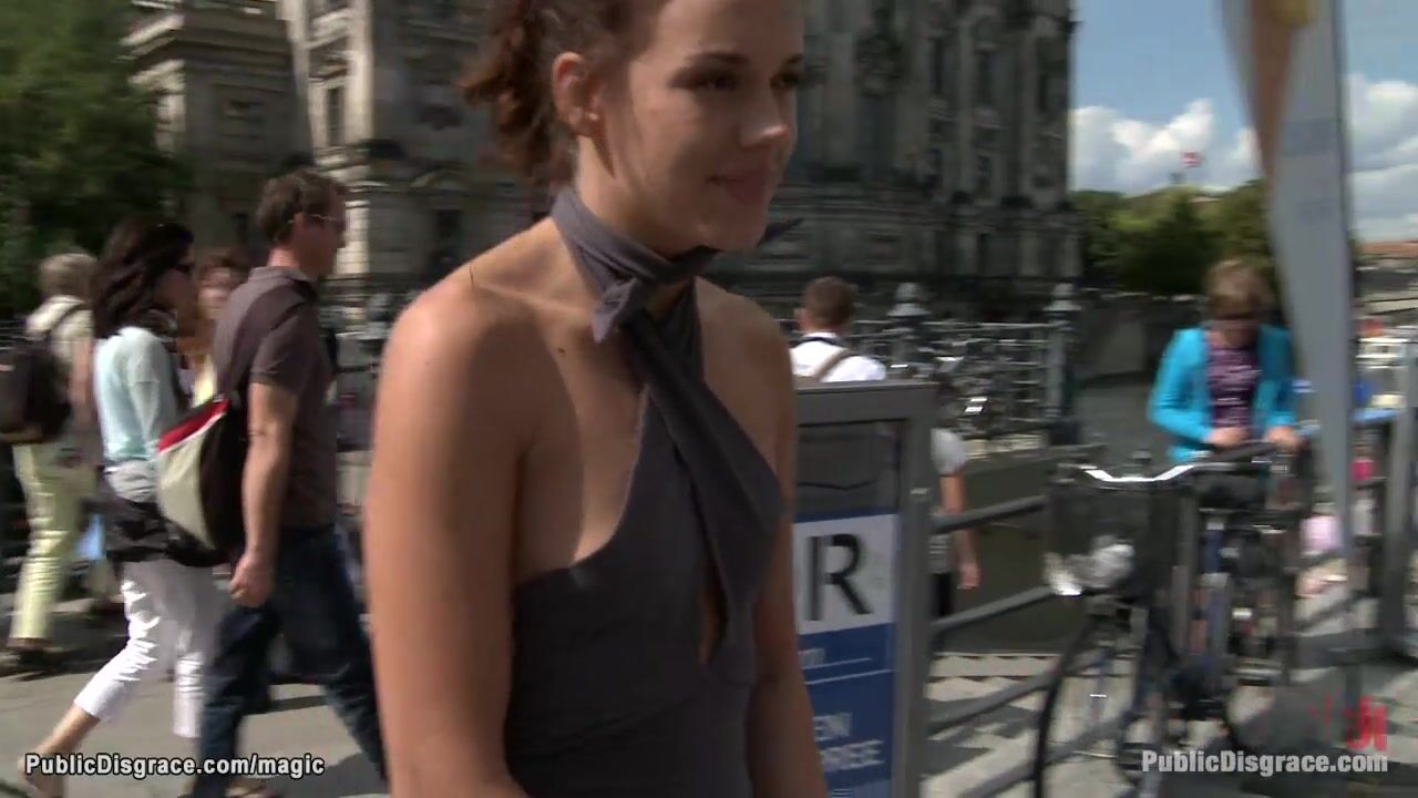 Hot German brunette slave Black Lady walk in public with remotely controlod vibrator in pussy then blindfolded with leather mask throat fucked by huge cock Tommy Pistol