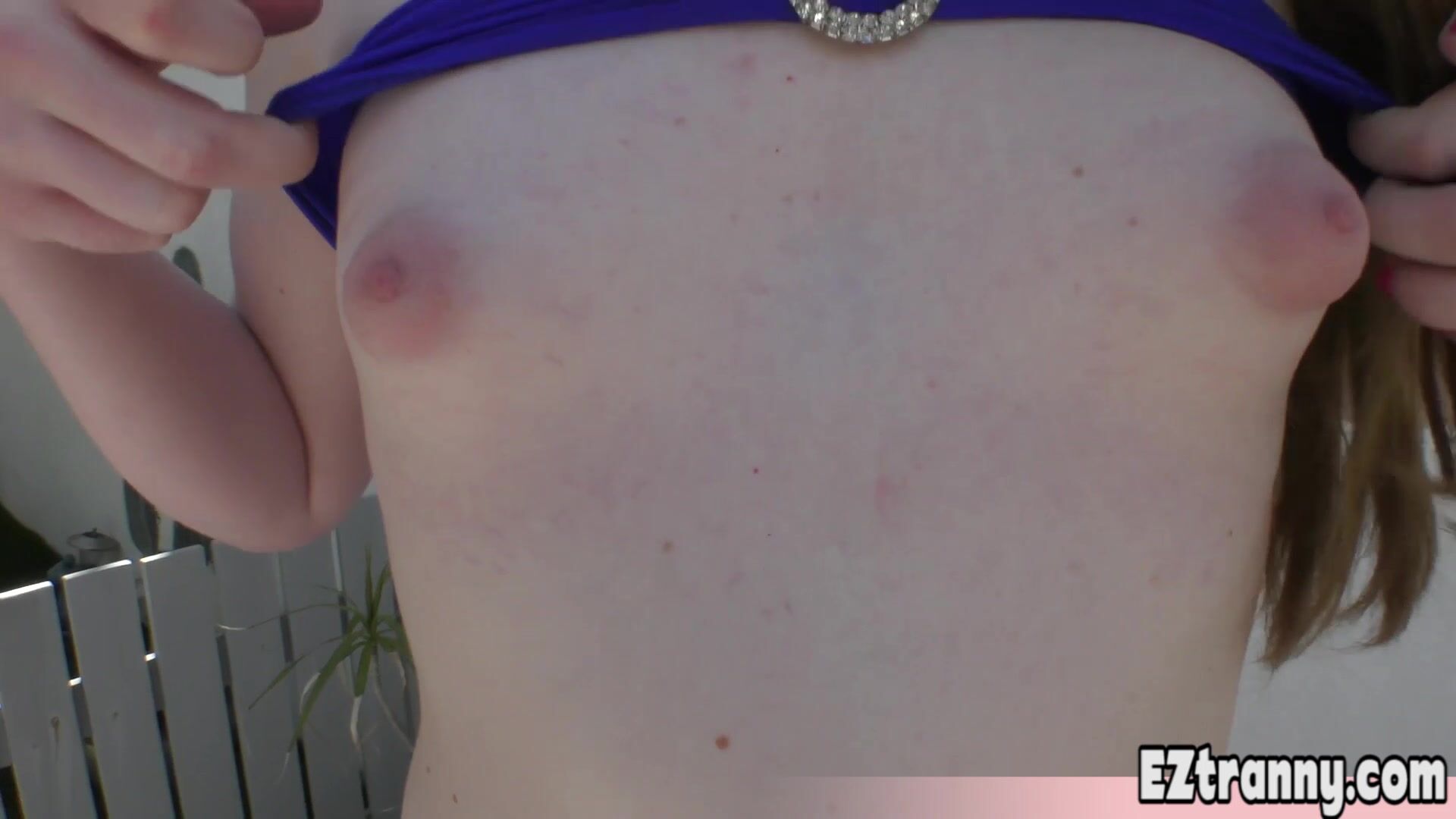 Hot redhead teen tranny Erica Cherry with small tits in sexy black fishnet stockings is flashing her big dick and starts masturbating then the flexible TS slut tasting her hard cock